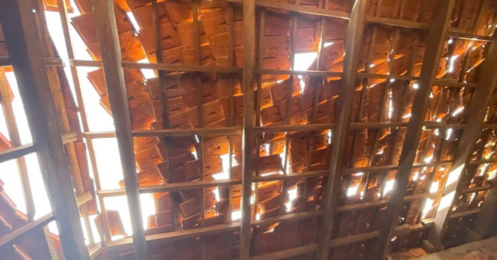 Phần mái ngói tầng hai khu nhà hiệu bộ bị sụt, phòng máy tính có 28 máy và lớp mẫu giáo 36 học sinh phải di dời.