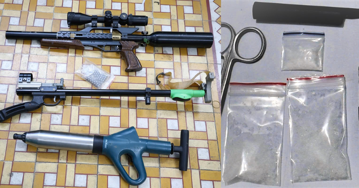Qua kiểm tra, lực lượng công an thu giữ 3 bọc nylon bên trong chứa tinh thể màu trắng nghi là ma túy, một khẩu súng hơi, một cây nã cùng nhiều đồ vật liên quan.