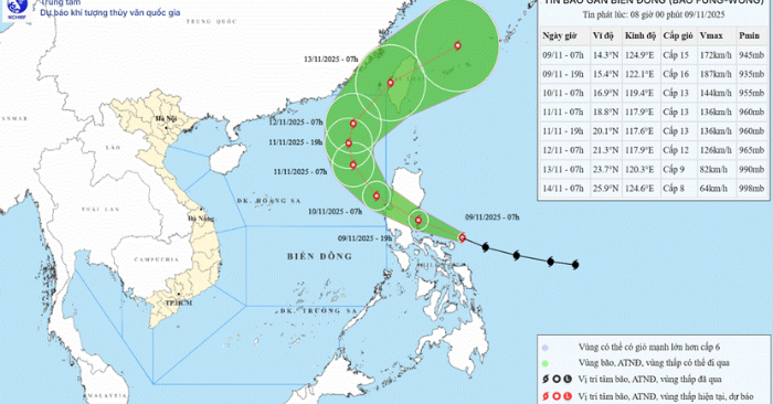 Theo Trung tâm Dự báo khí tượng thủy văn quốc gia, hồi 7 giờ sáng 9-11, tâm bão Fung Wong ở khoảng 14,3 độ vĩ Bắc và 124,9 độ kinh Đông, trên vùng biển phía Đông miền Trung Philippines. Vùng gần tâm bão có gió mạnh cấp 15, giật trên cấp 17.