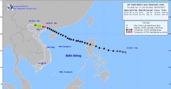 Hướng di chuyển của áp thấp nhiệt đới sau khi suy yếu từ bão số 11 vào trưa ngày 6/10. ( Ảnh: Khai Mở)