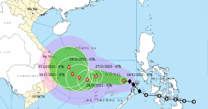 Sang ngày 28/11, bão chuyển hướng Tây Tây Nam, duy trì tốc độ 5–10 km/h và tiếp tục mạnh thêm lên cấp 11, giật 14. Vùng nguy hiểm được cảnh báo mở rộng đáng kể khiến khu vực giữa Biển Đông và vùng biển phía Bắc Trường Sa đối mặt với mức rủi ro thiên tai cấp 3, có thể kéo dài tới cuối ngày 29/11.