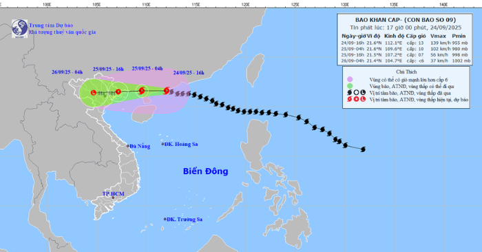 Theo Trung tâm Dự báo Khí tượng Thủy văn Quốc gia, hồi 16h ngày 24/9, tâm bão số 9 ở vị trí 21,6°N–112,1°E, cách Móng Cái (Quảng Ninh) khoảng 450 km về phía Đông. Sức gió mạnh nhất cấp 13 (134–149 km/h), giật cấp 16. Bão di chuyển theo hướng Tây Tây Bắc với vận tốc 20 km/h.