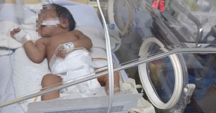 Theo người thân; bé được sinh thường tại nhà, không có sự hỗ trợ y tế. Gia đình đã sử dụng liềm – một dụng cụ lao động không được vô trùng – để cắt rốn, gây tổn thương vùng bìu và nguy cơ nhiễm trùng. Sau sinh; người mẹ còn cho bé ăn cơm như một hình thức “lấy vía ăn khỏe”, dẫn đến thủng dạ dày.