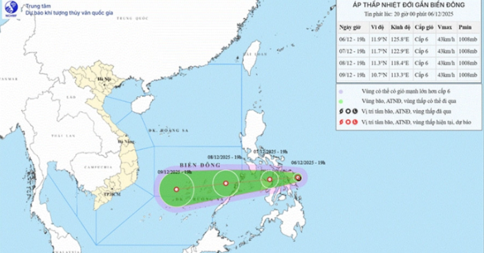 Theo thông tin từ cơ quan khí tượng, vào tối 6-12, tâm áp thấp nhiệt đới được xác định ở tọa độ 11,9 độ Vĩ Bắc và 125,8 độ Kinh Đông, thuộc khu vực ven biển miền trung Philippines. Đây là thời điểm hệ thống bắt đầu hình thành rõ ràng và có xu hướng mạnh dần lên với gió cấp 6, giật cấp 8. Hướng di chuyển chủ yếu theo Tây với vận tốc khoảng 5 km/giờ, nhưng dự báo sẽ nhanh hơn khi tiến gần Biển Đông.