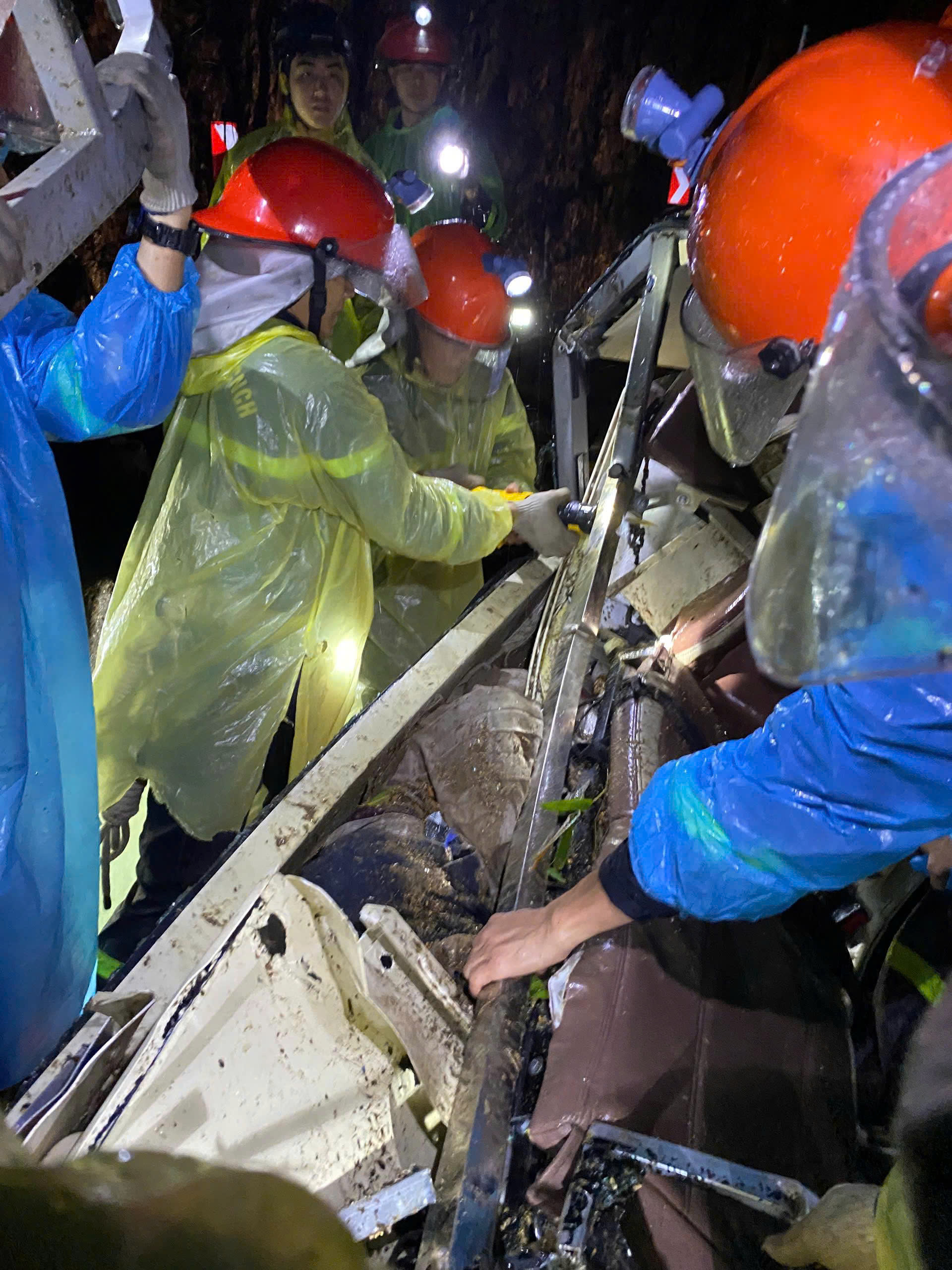 Lực lượng cứu hộ đang cứu hộ người mắc nạn trong xe (Ảnh: Tuổi Trẻ)