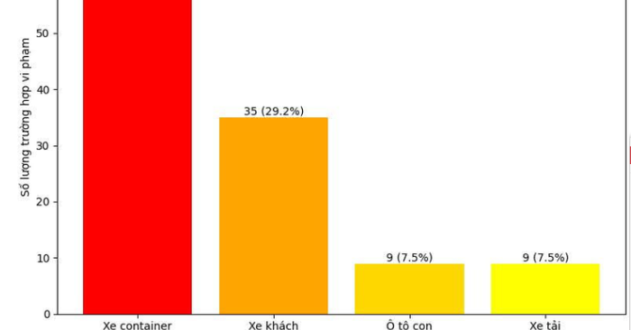 Theo quy định, mỗi trường hợp vi phạm này bị xử phạt hành chính từ 4 đến 6 triệu đồng và bị tước 4 điểm trên giấy phép lái xe. Số liệu thống kê trong năm 2025 và những tháng đầu năm 2026 cho thấy đã có tổng cộng 120 tài xế bị xử phạt lỗi tương tự. Trong danh sách này, loại hình xe container chiếm số lượng nhiều nhất với 67 trường hợp, tiếp đó là 35 xe khách, cùng một số ô tô con và xe tải.