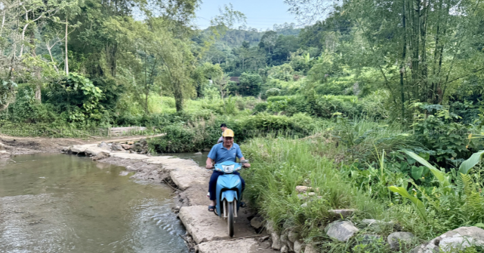 Hiện người dân chỉ có một “cầu tạm” làm bằng vài tấm bê tông đặt trên hai ống cống thoát nước. Khi mưa lớn, nước dâng ngập, phương tiện không thể qua lại, buộc họ phải đi vòng qua rừng hàng giờ đồng hồ.