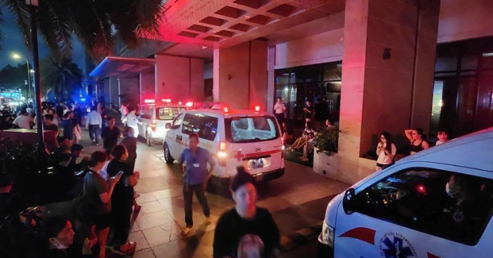Hàng trăm cư dân nhanh chóng tập trung tại khuôn viên dưới sân, chờ thông báo an toàn; từ ban quản lý và lực lượng chức năng.