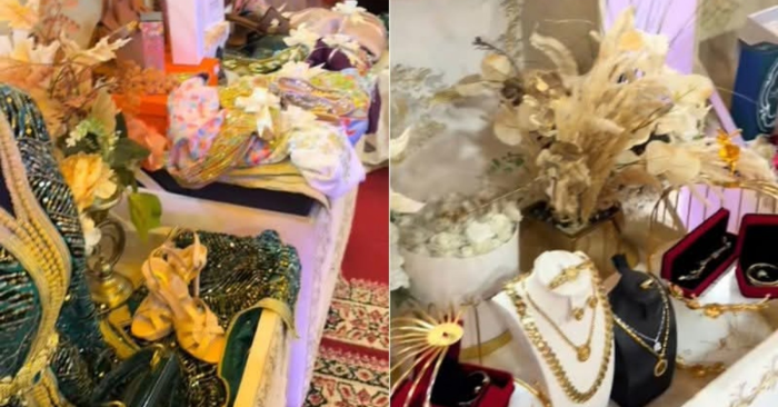 Đặc biệt, hình ảnh các hòm sính lễ được mở ra, bên trong là vàng, trang sức, quần áo, mỹ phẩm, túi xách… càng khiến đám cưới thêm phần lộng lẫy.