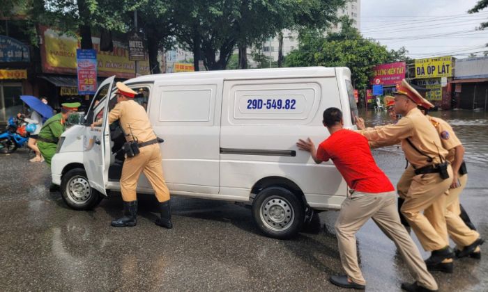Đội CSGT đường bộ số 7 đã điều động ô tô đặc chủng chở người dân vượt qua khu vực nguy hiểm. Trung tá Vương Đăng Cường – Đội trưởng Đội CSGT số 7 – cho biết đơn vị cắt cử cán bộ trực chiến tại các điểm ngập trọng yếu để xử lý tình huống kịp thời, đảm bảo an toàn cho nhân dân trong mưa bão.