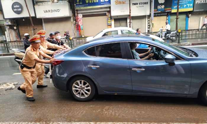 Tại phố Nguyễn Lương Bằng, dù nước đã rút bớt sau mưa lớn đêm 30/9, hàng loạt ô tô vẫn nằm chết máy giữa đường. Sáng 1/10, Thiếu tá Lưu Văn Tuấn cùng các đồng đội thuộc Đội CSGT đường bộ số 3 được phân công điều tiết giao thông, đồng thời giúp đẩy các xe hư hỏng vào lề đường.
