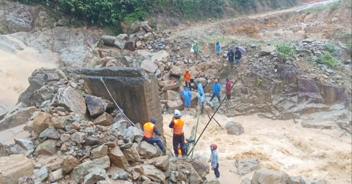 Lực lượng chức năng xã Phước Chánh (TP Đà Nẵng) đã khẩn cấp làm cầu tạm bắc ngang dòng nước xiết, giúp cô giáo mang thai 37 tuần vượt suối, vượt hơn 20 km đường sạt lở an toàn đến bệnh viện.