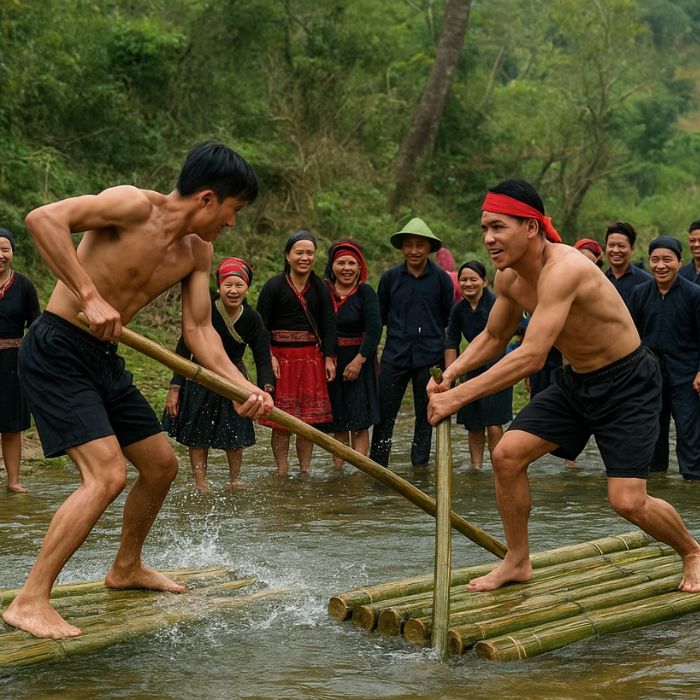 Trò chơi nghe tên tưởng nghiêm trọng, nhưng thật ra lại vui không tưởng. “Đánh mảng” – tức là hai đội trai bản đứng trên hai chiếc mảng tre, dùng sào tre dài để xô, đẩy, giữ thăng bằng. Ai đẩy được đối thủ rơi xuống nước trước là thắng. Nhưng thật ra, thắng thua chỉ là phụ – cái chính là… ai té trước thì cả bản được cười trước!