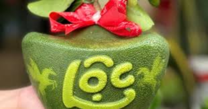 Quả bưởi tạo hình thỏi vàng có chữ "lộc" (Ảnh: Chụp màn hình/ Người lao động)