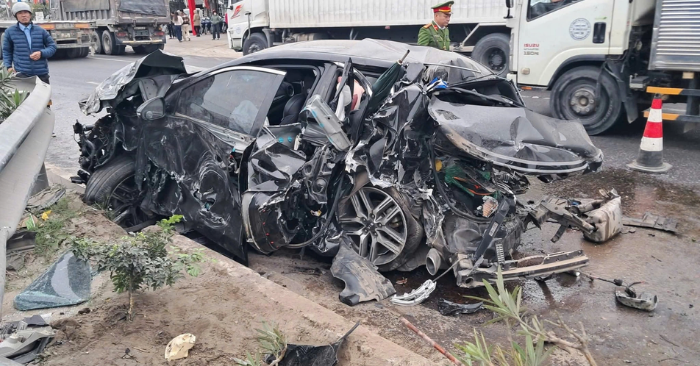 Lực tông quá mạnh từ phía sau đã đẩy chiếc xe con văng đi một đoạn dài trước khi va đập mạnh vào dải phân cách giữa đường. Sau chuỗi va chạm liên tiếp, chiếc xe ô tô bị vò nát đến mức không thể nhận diện được thương hiệu nếu chỉ nhìn qua phần khung vỏ. Các mảnh vỡ từ kính xe, nhựa và kim loại văng tung tóe khắp mặt đường, minh chứng cho sự khốc liệt của vụ tai nạn diễn ra trong tích tắc.
