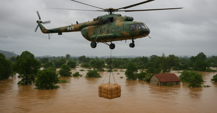 Video ghi lại cho thấy trực thăng tiếp cận khu vực ngập sâu, thực hiện thao tác thả hàng chính xác trong điều kiện thời tiết phức tạp, giúp người dân kịp thời nhận được nguồn hỗ trợ cần thiết.