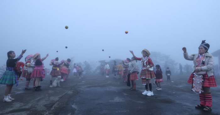 Hội xuân của người Mông diễn ra trên đỉnh Suối Giàng mỗi dịp Tết. Năm nay, lễ hội kéo dài từ mùng 3 đến mùng 7 tháng Giêng. Từ sáng sớm, phụ nữ diện trang phục đẹp nhất đến sân hội. Những bộ váy thêu tay nổi bật giữa màn sương núi. Không khí rộn ràng tiếng nói cười khắp sườn đồi. Trò ném còn thu hút đông đảo thanh niên tham gia. Quả còn nhiều màu sắc được làm thủ công bằng vải. Một số nơi dùng bóng thay thế cho phù hợp điều kiện.