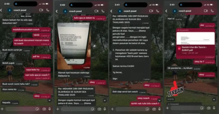 Đơn tố cáo kèm nhiều tin nhắn WhatsApp được gia đình Danish gửi lên Liên đoàn điền kinh Malaysia (MA). Gia đình cho rằng hành động của vị HLV đã “tước đi cơ hội xứng đáng” của Danish ở đội tiếp sức 4x100m và phơi bày lỗ hổng lớn trong cơ chế tuyển chọn.