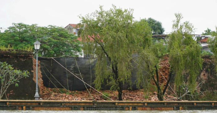 Tường được xây theo kết cấu ba lớp: trong và ngoài bằng gạch vồ, giữa là đất sét nhồi. Nhiều đoạn tường lân cận cũng đã nghiêng, xuất hiện vết nứt và có khả năng sập nếu mưa lớn kéo dài hoặc nước dâng cao tiếp tục tác động.