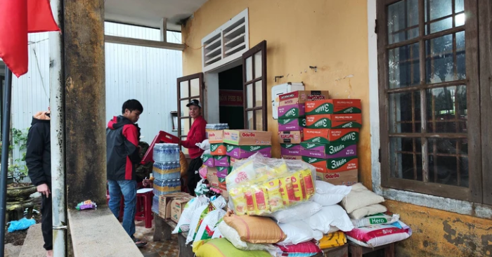 Gạo, mì tôm, bánh, nước mắm, nước lọc được bà con thôn Phe Ba cùng nhau gom góp, gửi vào cho bà con Nam Trung Bộ (Ảnh: Tuổi Trẻ)