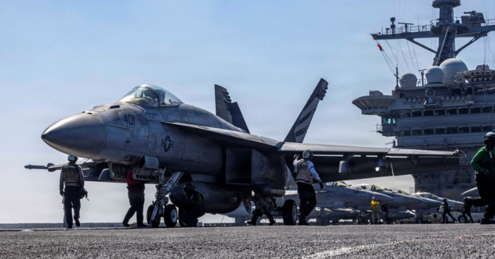Máy bay chiến đấu F/A-18E Super Hornet chuẩn bị cất cánh từ tàu sân bay USS Abraham Lincoln của Hải quân Mỹ tại biển Ả rập ngày 15/2. (Ảnh: Chụp màn hình báo Dân trí).