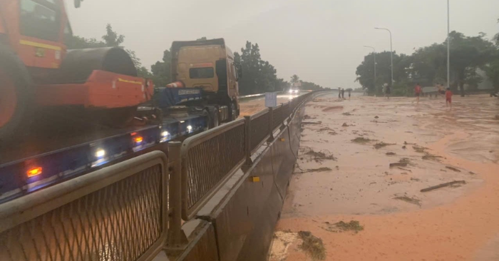 Mưa lớn kéo dài khiến hàng trăm mét khối cát đỏ từ triền đồi đổ ập xuống, phủ kín hơn 100m mặt đường quốc lộ 1 đoạn qua xã Lương Sơn (tỉnh Lâm Đồng), gây ách tắc và tiềm ẩn nguy cơ mất an toàn giao thông
