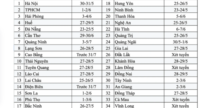 Hiện đã có 32 trên 34 tỉnh thành công bố chi tiết kế hoạch tuyển sinh lớp 10 công lập. Trong số đó, có 4 tỉnh sử dụng phương thức xét tuyển gồm Đắk Lắk, Lâm Đồng, Cà Mau và Vĩnh Long. Có 4 địa phương chỉ tổ chức thi tuyển vào các trường chuyên. Phần lớn 28 tỉnh còn lại tổ chức thi vào cuối tháng 5 hoặc đầu tháng 6, phổ biến nhất là ngày 27-28/5, riêng thành phố Cần Thơ thi muộn nhất vào hai ngày cuối tháng 6.