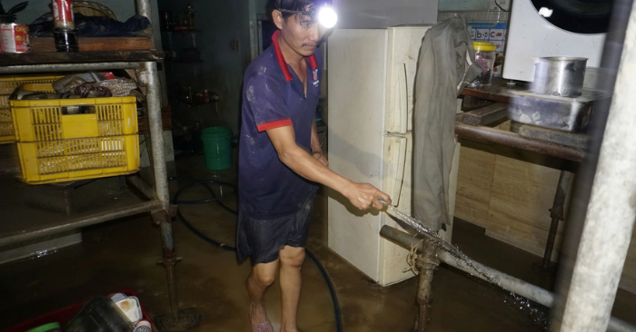 Người dân tại nhiều xã, phường tranh thủ dọn dẹp nhà cửa ngay trong đêm, song mất điện khiến việc này rất khó khăn. Không ít hộ phải tận dụng nước lũ để vệ sinh đồ đạc.