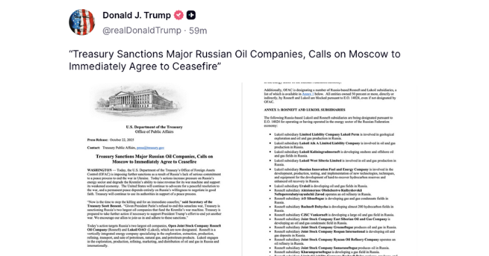 Rạng sáng 23/10 (giờ Việt Nam), Bộ Tài chính Mỹ thông báo áp đặt lệnh trừng phạt mới đối với hai tập đoàn dầu khí hàng đầu của Nga – Rosneft và Lukoil, cùng 34 công ty con trực thuộc, với lý do Moskva thiếu cam kết trong tiến trình hòa bình.
