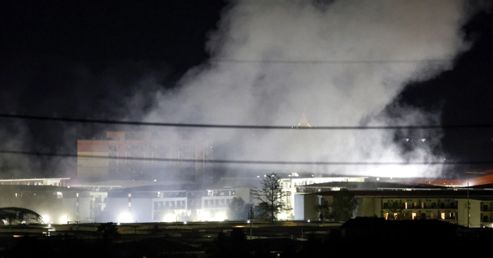 Khói bốc lên từ khu phức hợp KK Park ở Myawaddy, Myanmar, nhìn từ Mae Sot, ngày 24/10. (Ảnh: Khai Mở)