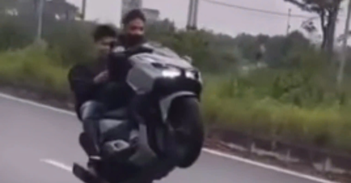 Ngoài hành vi chạy bằng một bánh, T. còn vi phạm không đăng ký xe, không gương chiếu hậu bên trái, không đội mũ bảo hiểm và chở người không đội mũ. T. cũng chưa đủ 18 tuổi nhưng điều khiển xe máy dung tích lớn. Người ngồi sau N.Đ.M. (SN 2006) bị phạt 500.000 đồng.