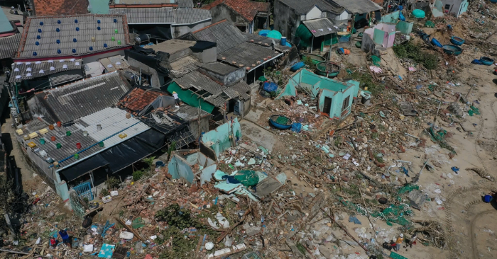 Tại làng chài Xuân Thạnh (xã Phù Mỹ Đông, tỉnh Gia Lai), khung cảnh hoang tàn hiện ra khi người dân trở về. Nhà cửa sập đổ, mái tôn bay khắp nơi, ngư cụ tan nát.