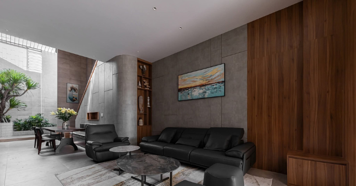Ngoài ra, cấu trúc lệch tầng và liên thông giữa các tầng được ưu tiên để tạo sự kết nối giữa các thành viên trong gia đình mà không làm mất đi tính riêng tư. Dù không nằm chung mặt sàn, các khu vực sinh hoạt vẫn có thể nhìn thấy nhau qua khoảng trống đứng. Đây là cách kiến trúc không chỉ giải quyết sự bó hẹp diện tích mà còn biến những “khoảng trống” thành giá trị sống.