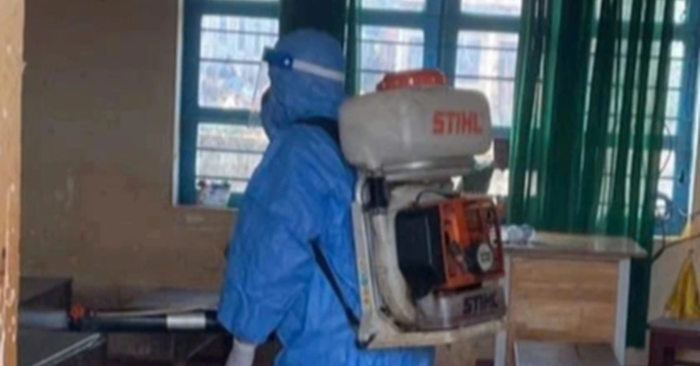 Ngành y tế phun khử khuẩn các lớp học nơi có học sinh mắc quai bị (Ảnh: Chụp màn hình báo Dân trí)