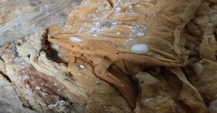 Số lòng lợn có dấu hiệu nấm mốc, không đảm bảo điều kiện bảo quản.