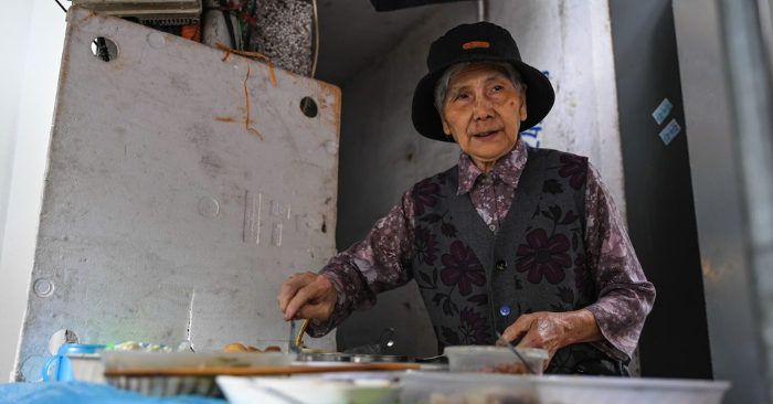 10h30 mỗi ngày, bà Đỗ Thị Hương 81 tuổi, phường Ba Đình, Hà Nội, đều cặm cụi sắp xếp, lau dọn mấy bộ bàn ghế đặt ở đầu hẻm trước nhà. Rồi bà lại bưng từng món ăn còn nóng hổi ra bày biện, sẵn sàng chờ đón những vị khách quen ghé quán.Gọi là quán nhưng khu vực bán hàng của bà cụ tuổi 81 chỉ rộng hơn 1m², quanh chiếc ô đứng che nắng mưa. Không gian đủ xếp 10 chiếc ghế nhựa và 3 chiếc bàn gỗ nhỏ.