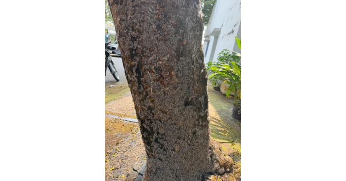 Hàng ngàn con sâu róm nghi xuất hiện tại khu dân cư Phú Hòa. Chúng bò từ cây xuống đường rồi tràn vào nhà, gây bất an cho cư dân.