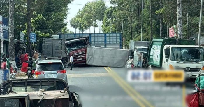 Trưa 20-12, một vụ tai nạn liên hoàn giữa xe ben, hai xe tải và xe rác xảy ra trên đường HL 412, phường Tân Uyên, TP.HCM, khiến một xe tải lật ngang giữa đường.
