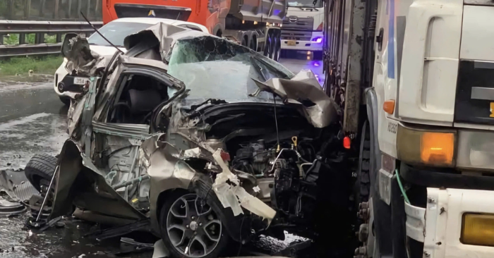 Chưa kịp xử lý, xe đầu kéo do anh Nguyễn Văn Quân cầm lái lao tới từ phía sau. Với trọng tải lớn và tốc độ không giảm, xe container đâm mạnh vào đuôi ôtô Kia. Lực ép khủng khiếp khiến thân xe con bị nghiền nát, khung sườn biến dạng, trần xe lõm sâu. Kính chắn gió vỡ vụn, cửa xe bung ra khỏi bản lề.