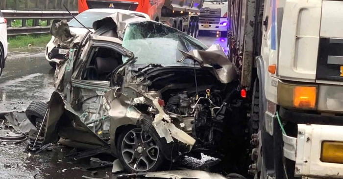 Trong vụ tai nạn giao thông đầy bất ngờ xảy ra sáng 8/11 tại km 277+400 trên Quốc lộ 1A (đoạn qua phường Tam Điệp, tỉnh Ninh Bình), một chiếc ô tô con bị bẹp rúm hoàn toàn sau cú va chạm liên hoàn giữa hai xe tải và xe con.