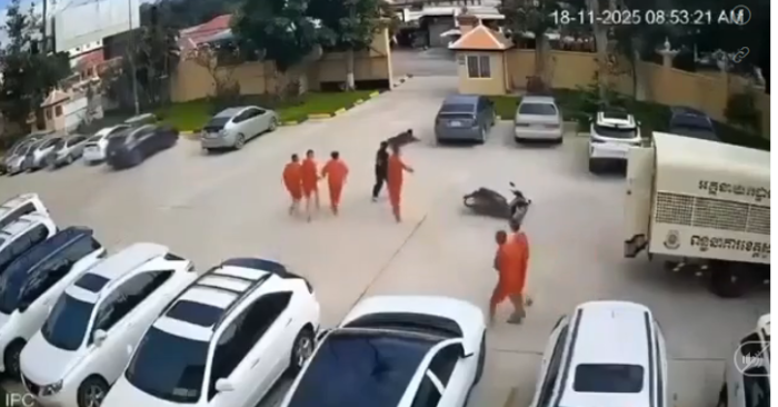 Hiện trường hỗn loạn khi nhóm tù nhân bỏ trốn khỏi khuôn viên tòa án –( Ảnh: Khmer Times)