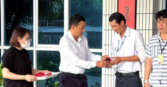 Ông Nguyễn Văn Bé Ba, Chủ tịch Công đoàn cơ sở Công ty TNHH Dụ Đức Việt Nam, trao quà cho công nhân đủ 15 năm thâm niên vào tháng 11-2025.(Ảnh: Chụp màn hình/Tiền Phong)