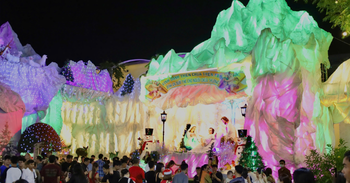 Tại các khu vực quanh nhà thờ và xóm đạo, lượng người đổ về ngày càng đông khi màn đêm buông xuống. Các tuyến đường như Phạm Thế Hiển chật kín dòng người dạo chơi, tham quan và ghi lại khoảnh khắc mùa lễ hội.