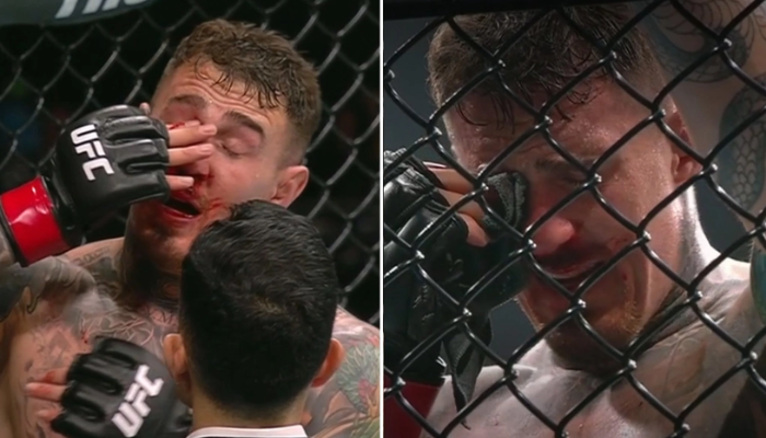 Tom Aspinall bị Ciryl Gane chọc vào mắt ở cuối hiệp một trận tranh đai hạng nặng trong sự kiện UFC 321, tại nhà thi đấu Etihad, UAE ngày 25/10/2025. (Ảnh: Khai Mở)