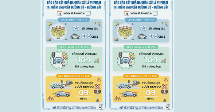 Từ ngày 18/4/2026, lực lượng Cảnh sát giao thông trên phạm vi toàn quốc đã đồng loạt triển khai đợt cao điểm kiểm tra tại các điểm giao cắt. Để đảm bảo trật tự và an toàn, ngành chức năng huy động 75 tổ công tác với 205 cán bộ chiến sĩ trực tiếp túc trực tại những đường ngang dân sinh có mật độ phương tiện di chuyển cao. Sự hiện diện của các tổ công tác tập trung vào việc điều tiết và phát hiện các hành vi gây mất an toàn giao thông tại những điểm nóng trọng điểm.