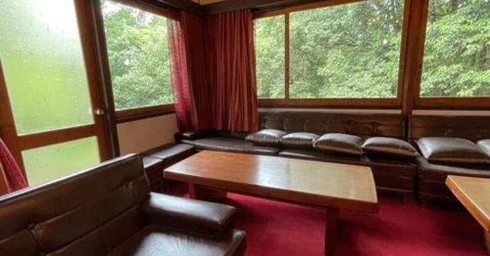 Bên trong vẫn giữ lại nét kiến trúc cổ điển với thảm đỏ, đèn chùm mạ vàng và quầy bar gỗ cũ. Khu vườn rộng quanh nhà trồng hồng, dâu rừng và thông, tạo cảm giác tĩnh lặng, biệt lập.