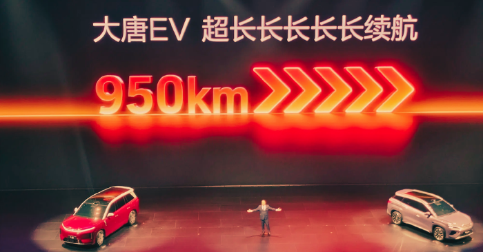 Lu Tian, tổng giám đốc kinh doanh của BYD, giới thiệu các mẫu xe mới có tầm hoạt động 950 mỗi lần sạc.(Ảnh: Chụp màn hình báo VnExpress).